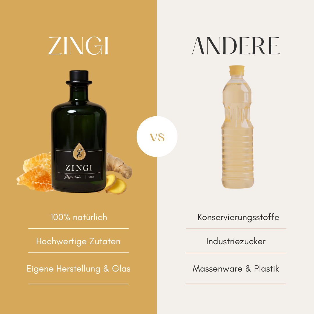 Wir glauben, dass gute Produkte keine langen Zutatenlisten brauchen. Genau deshalb besteht ZINGI aus nur drei Zutaten.